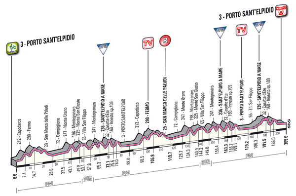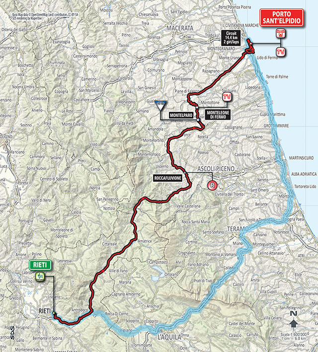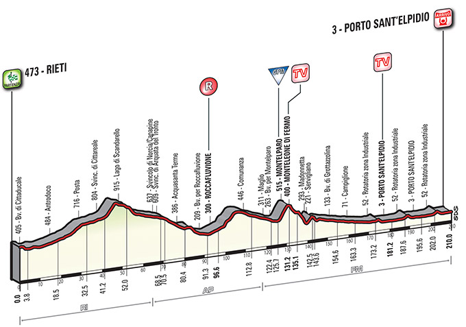 Después de la montaña y en vísperas de la crono final, le toca el turno a una jornada más sencilla aunque bastante larga entre la localidad de Rieti, capital de la provincia homónima, y la población costera de Porto Sant´Elpidio, en la provincia de Fermo, con un perfil ondulado durante los 2/3 iniciales del recorrido, destacando la cota puntuable de Montelparo, pero con los últimos 60 km básicamente llanos, incluyendo un circuito final de 14,5 km al que los corredores tendrán que dar 2 vueltas y media, siendo en principio una jornada muy favorable para los velocistas.