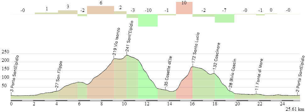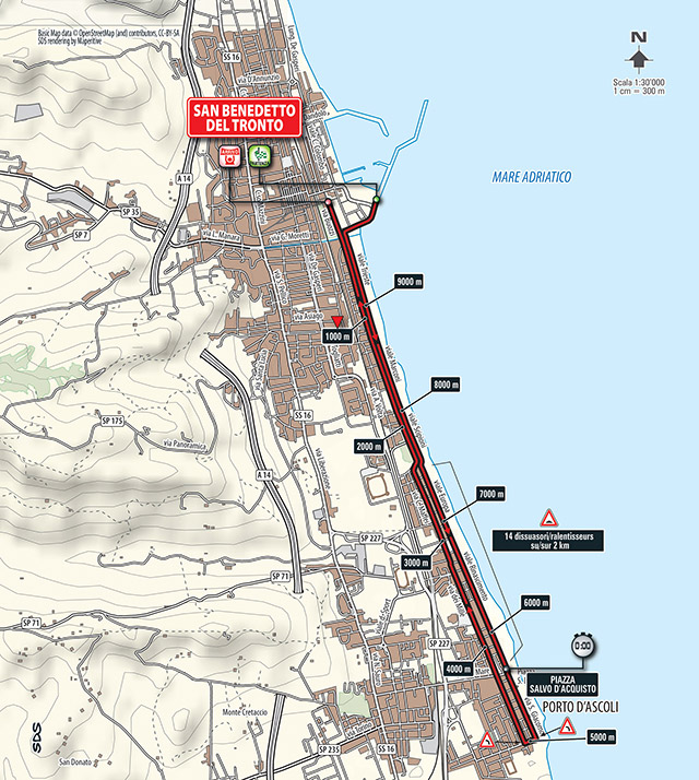 Durante todo la ruta los ciclistas irán paralelos al mar, primero dirigiéndose hacia sur hasta que al llegar a Porto Ascali giren 180º y cambien de sentido, regresando a la zona centro de San Benedetto. Salvo por ese cambio de sentido y la revirada salida, el trazado es muy rectilíneo y favorable para los rodadores potentes, capaces de mover enormes desarrollos sin “clavarse”, aunque debido al escaso kilometraje las diferencias no deberían ser grandes.