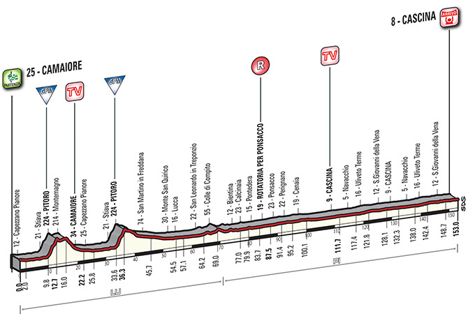 2ª ETAPA (Jueves 12 Marzo): CAMAIORE – CASCINA (153 km). Rutómetro / Salida – Llegada