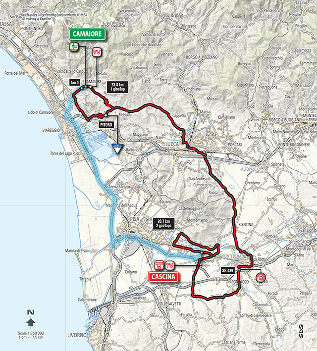 La primera etapa en línea unirá el propio Camaiore con la localidad de Cascina, en la provincia de Pisa, con un recorrido que incluye de salida un doble paso por la cota de Pitoro, con casi km a más del 7% de media, pero que tras abandonar el circuito inicial y dirigirse hacia el sureste cuenta con más 100 km casi completamente llanos, incluyendo un circuito final de 20,5 km en torno a Cascina al que los corredores tendrán que dar dos vueltas, con tres pasos por la línea de meta.