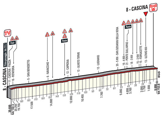 En definitiva, una jornada muy favorable para los sprinters, que pese a la doble subida de inicio cuenta después con suficiente llano como para que el pelotón pueda controlar las fugas, siendo lo más probable que la victoria se decida mediante una «volatta» masiva. Eso fue justo lo que sucedió el año pasado, en una etapa relativamente similar (aunque algo más dura) y con el mismo circuito final, llevándose el triunfo Pelucchi al batir en el sprint a Demare y Greipel.