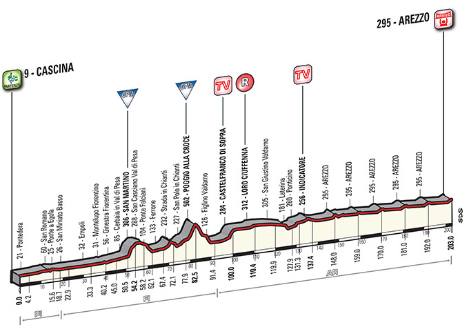 3ª ETAPA (Viernes 13 Marzo): CASCINA – AREZZO (203 km). Rutómetro / Salida – Llegada