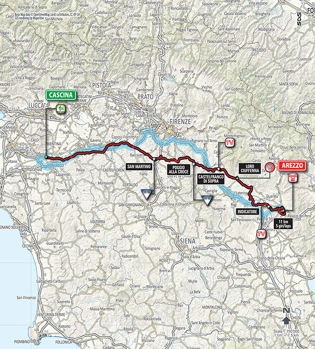 Después de dos jornadas cercanas a la costa, la tercera etapa ya se dirigirá hacia el interior, con algo más de 200 km entre Cascina y la ciudad de Arezzo, capital de la provincia homónima, teniendo de nuevo un recorrido sin grandes puertos pero con varias cotas en el tramo central, destacando la subida al Poggio alla Croce, con 4,6 km al 6%.