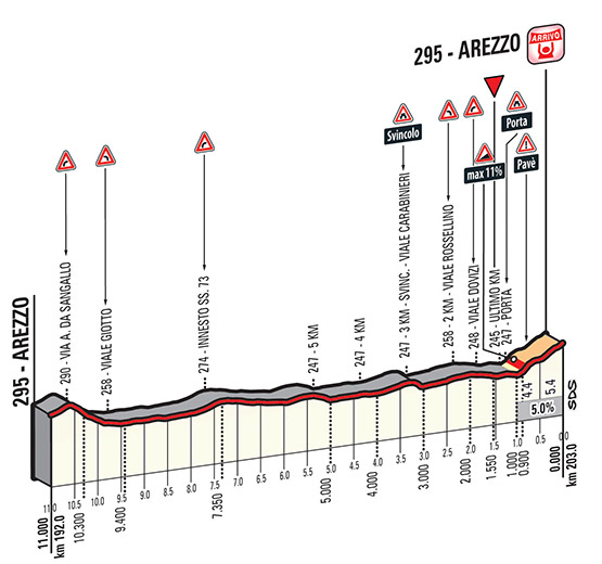 - Arezzo -6 pasos-, np (km 148 / 159 / 170 / 181 / 192 / Meta): 295 m – 1 km – 5 %