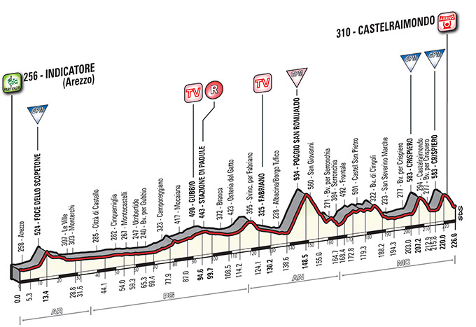 El 4º día de carrera le toca el turno a la etapa más larga de esta edición, con 226 km entre Indicatore y la localidad de Castelraimondo, en la provincia de Macerata, teniendo que superar un trazado de media montaña en el que destaca el Poggio San Romualdo, una ascensión bastante regular al 7% durante casi 10 km, con un trazado repleto de curvas de herradura, y en el tramo final el doble paso por Crispiero, una subida corta e irregular pero con tramos durísimos, con 2,5 km finales a más del 10% (incluyendo una zona de 500 m al 13%), y coronándose por última vez a sólo 6 km de meta, casi todos ellos de descenso pero con los 300 m finales, ya en Castelraimondo, picando hacia arriba.