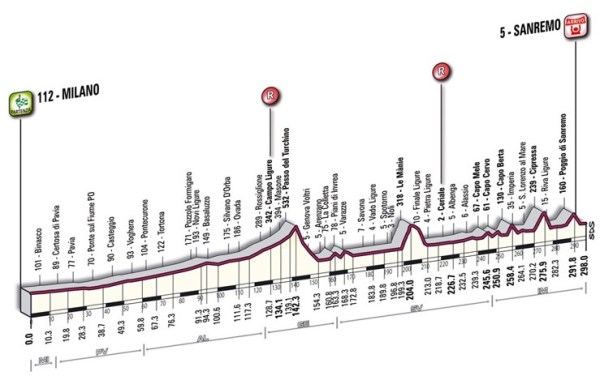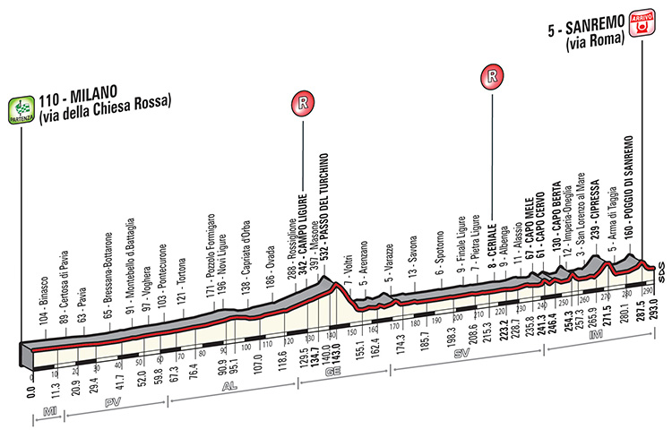 - Poggio di Sanremo (km 287,5): 160 m – 3,7 km – 3,7 %