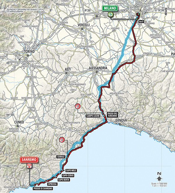 De hecho, durante muchos años la única subida reseñable fue el Passo del Turchino, que afrontado por el norte no pasa de ser un 3ª, colocado además muy lejos de meta. Pero a medida que la carrera fue resultando cada menos selectiva la organización fue endureciendo la ruta para evitar que grandes pelotones se jugaran la victoria al sprint, añadiendo diversas cotas. Asi, en 1960 incluyeron el Poggio, una subida sin mayor dificultad (3,7 km al 3,7 %) pero cuya cercanía a la llegada y el hecho de que se afronte con muchos km en las piernas la convierten en decisiva, teniendo además un descenso bastante técnico. En 1982 llegó el turno de la Cipressa, una cota algo más exigente (5,6 km al 4,1%) aunque situada a mayor distancia de meta. Desde esa edición el recorrido se mantuvo prácticamente inalterable durante más de 25 años.