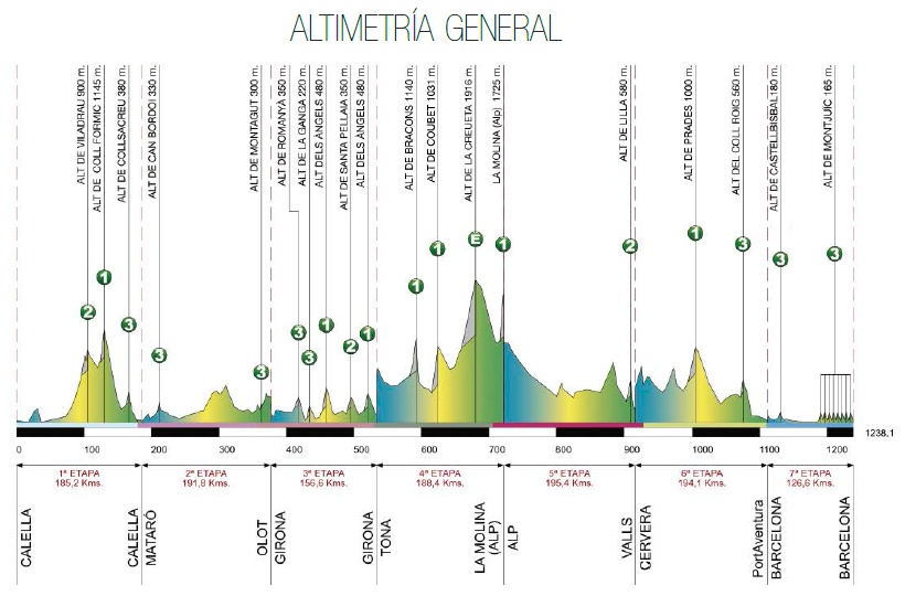 Donde sí debería haber movimientos de cierta importancia es en la 3ª etapa, con inicio y final en Girona. Con un trazado de media montaña, tendrá su punto de mayor importancia en la subida a l’Alt dels Àngels, a 13 kilómetros de meta, marcado de primera categoría (aunque de un modo excesivo) y que cuenta con unos números oficiales de 6 kilómetros al 5,5% de media, pero escondiendo 3,5 km centrales al 7-8% y varias rampas de dos dígitos. Sin embargo, la etapa reina llegará en la cuarta jornada, entre Tona y la estación de esquí de la Molina, en la Cerdanya. Cuatro puertos de cierta entidad figurarán en el recorrido: el Coll de Bracons, el Coll de Coubet-Canes, el Coll de la Creueta, con alrededor de 1000 m de desnivel acumulado, y la subida final a La Molina, en general tendida aunque con una rampa al 12% cerca de meta. Una etapa que, a la vista del restante recorrido, debería decidir la carrera.