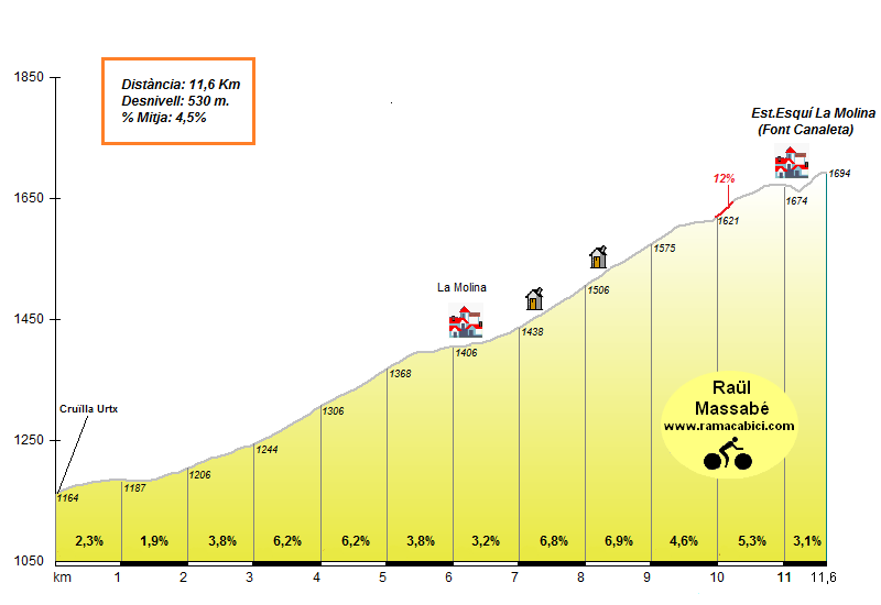 A continuación, bajada por lo general muy suave, sobre todo en su primer tramo, dirigiéndose a la Cerdanya, donde el año pasado la organización decidió dar un rodeo llano que por fortuna no se repite en esta edición. Este año, al llegar a la urbanización de Urtx se tomará un desvío a la izquierda para encarar directamente la subida final a La Molina, con varios km al 6-7% pero por buena carretera y con descansillos intercalados, estando lo más duro a 1,5 km de meta, con una rampa al 12%, y con la llegada situada en el parking de Font Canaleta.