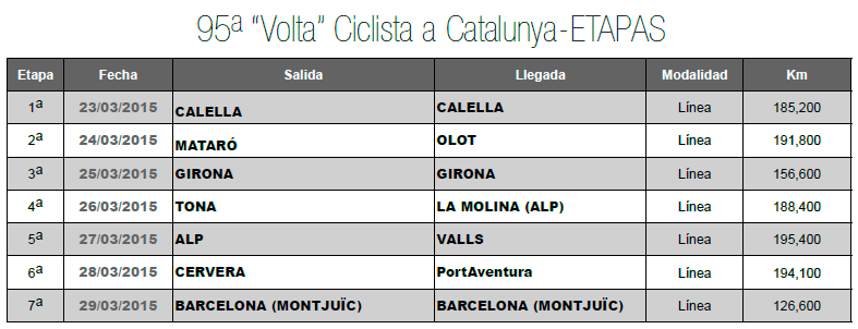 Durante esta semana, entre el lunes 23 y el domingo 29 de marzo, se celebra la 95ª edición de la Volta Ciclista a Catalunya, la prueba con mayor antigüedad del calendario nacional, así como la 3ª carrera por etapas con más ediciones disputadas en todo el mundo, sólo superada por el Tour de Francia y el Giro de Italia.