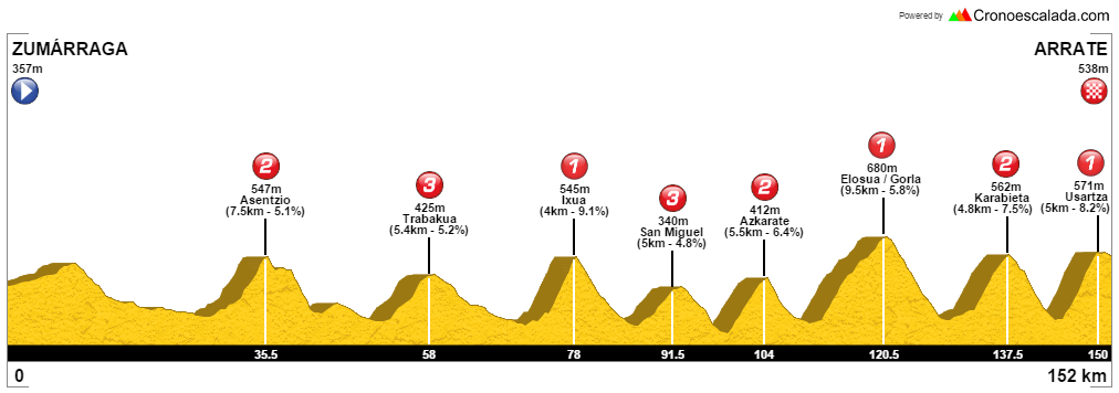 4ª ETAPA (Jueves 9 Abril): ZUMARRAGA – EIBAR / ARRATE (162,2 km). Rutómetro y mapa interactivo / Archivo en PDF