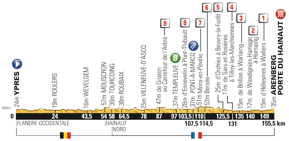 Así pues, y al igual que viene sucediendo desde 1977, la prueba se inicia en la localidad de Compiégne, en el departamento de Oise, dirigiéndose primero hacia el noreste, con Saint Quentin como la población de paso más importante, y sin dificultad reseñables durante los primeros 90 km, si bien la dirección y fuerza del viento pueden ser un factor clave para añadir desgaste o por el contrario hacer más llevadera la ruta. En cualquier caso, poco antes del km 100 y ya en el departamento de Nord, llegarán los primeros tramos de pavé, con 4 sectores bastante seguidos, y uno de ellos, Quievy, de gran dificultad, sobre todo por su longitud, 3,7 km, y tendencia ascendente, siendo catalogado de 4 estrellas. Más allá de su dificultad concreta, señalar que estos primeros sectores de adoquín son normalmente muy peligrosos debido al riesgo de montoneras, al haber todavía un pelotón muy numeroso.