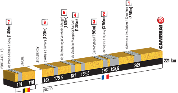Por otro lado, señalar que en el próximo Tour de Francia habrá de nuevo una etapa con pavé, en concreto la 4ª jornada, con llegada en Cambrai, que incluirá 7 sectores adoquinados, 6 de ellos en los últimos 50 km, para un total de 13,3 km sobre esta superficie -> perfil 2ª mitad de la etapa, destacando por su longitud y dificultad el tramo de Viésly a Quievy, con 3,7 km y 4 estrellas, aunque realizado en sentido contrario a como se pasa en la París-Roubaix, coincidiendo también Saint Python y Verchain Maugre.