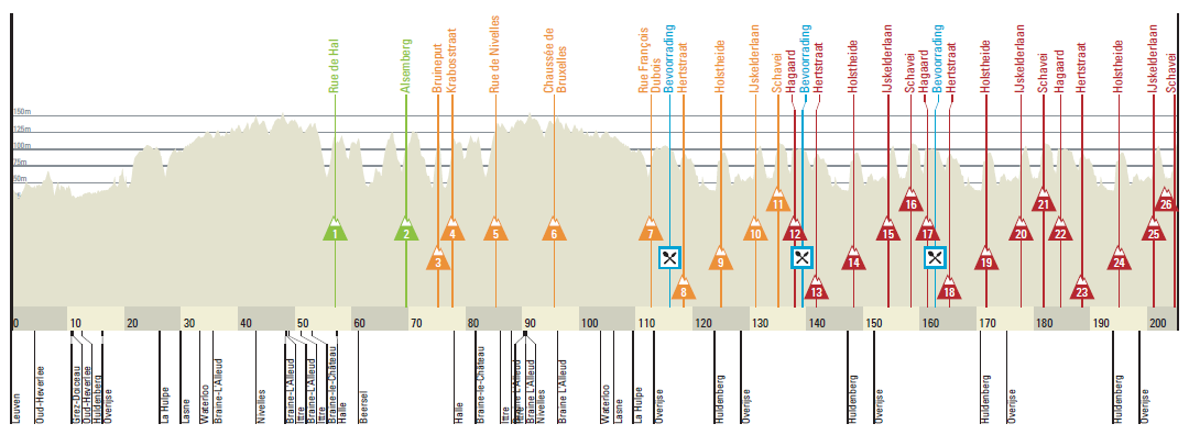 El trazado de la prueba, con inicio en Leuven y final en Oberijse (desde la edición de 2010, anteriormente acababa en Alsemberg), es básicamente llano durante los primeros 50 km, pero tras el paso por el municipio de Nivelles comienza la fiesta, teniendo que superar nada menos 26 cotas durante los últimos 150 km de la prueba, aunque varias de ellas repetidas en múltiples pasos, habiendo en realidad «sólo» 12 cotas distintas. En general no tienen mucha pendiente (si bien alguna cuenta con la superficie adoquinada), pero su acumulación provoca que sea un recorrido exigente y muy nervioso.