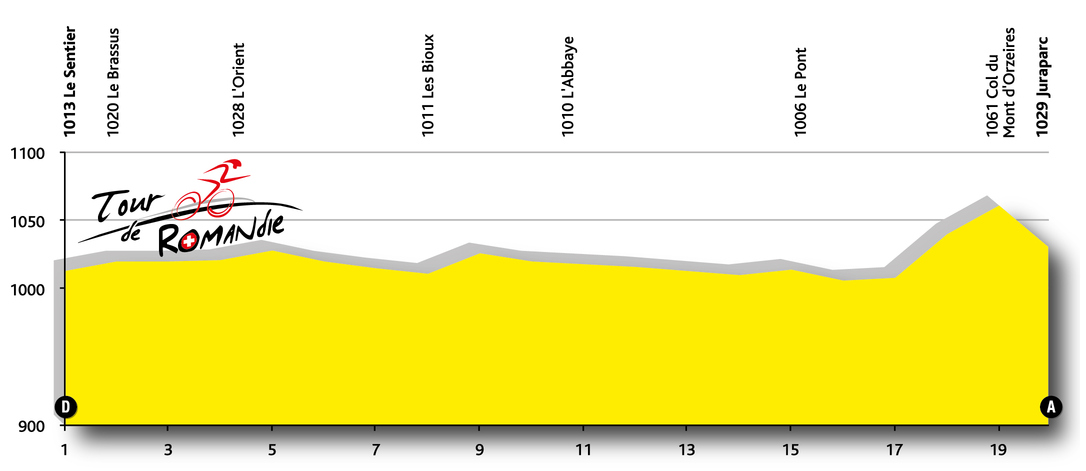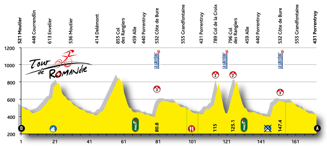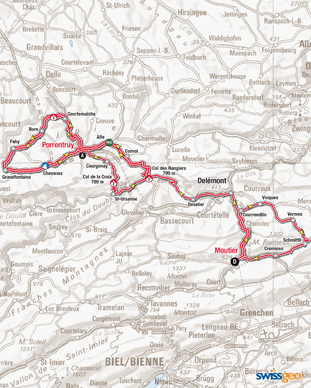 Así pues, la carrera se inicia con la mencionada crono por equipos, de 19 km y con un perfil básicamente llano a excepción de una pequeña cota cerca de meta, siendo en cualquier caso favorable para las escuadras con potentes rodadores. La primera etapa en línea, con final en Saint Imier, presenta un interesante trazado de media montaña, con 4 puertos de dificultad media entre los que destacan Haut de la Cote y Pontins por sus rampas, ambos con varios km seguidos al 9%, y Vue des Alpes (desde Valangin) por su cercanía a la llegada, con 6 km finales al 7,3% y la cima a 17 km de meta, un tercio de ellos de descenso, pudiendo dar mucho juego. La siguiente jornada también es de media montaña, incluyendo varios bucles en torno a Porrentruy, con un doble paso por Les Rangiers (el 1º por otra vertiente) y por la cota de Bure, esta última con 1,8 km al 7,4% y coronándose por segunda vez a 25 km de la llegada, pudiendo resolverse mediante una escapada o con un sprint reducido.