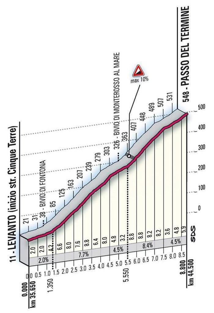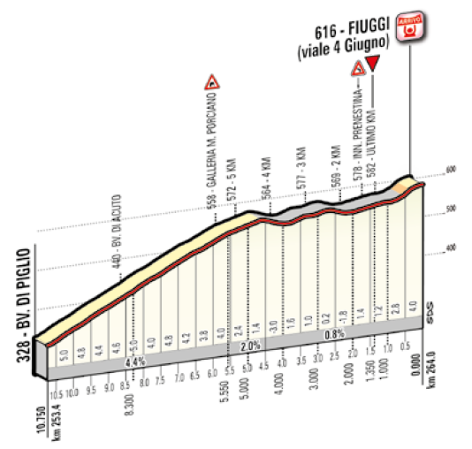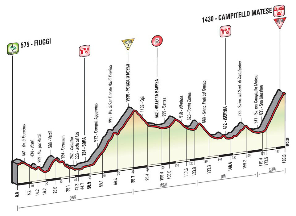 El fin de semana regresa la montaña, con una etapa de casi 190 km entre Fiuggi y Campitello Matese, en los Apeninos del sur, incluyendo el interminable Forca d´Acero, sin grandes rampas pero con 28 km de ascensión, y varias cotas no puntuables antes de la subida final a la estación de esquí, que con 13 km al 7% puede hacer daño si el ritmo es elevado, aunque dependerá mucho de la actitud de los favoritos. Será la 7ª ocasión en que el Giro acabe aquí una etapa, con los últimos antecedentes de 2002, en una etapa unipuerto con triunfo para Simoni -> vídeo, el cual ese mismo día fue expulsado de la carrera debido a un positivo por cocaína que luego resultó ser falso; y 1994, con victoria para Berzin -> vídeo, que de este modo se hacía con un liderato que ya no abandonaría hasta el final de la prueba.