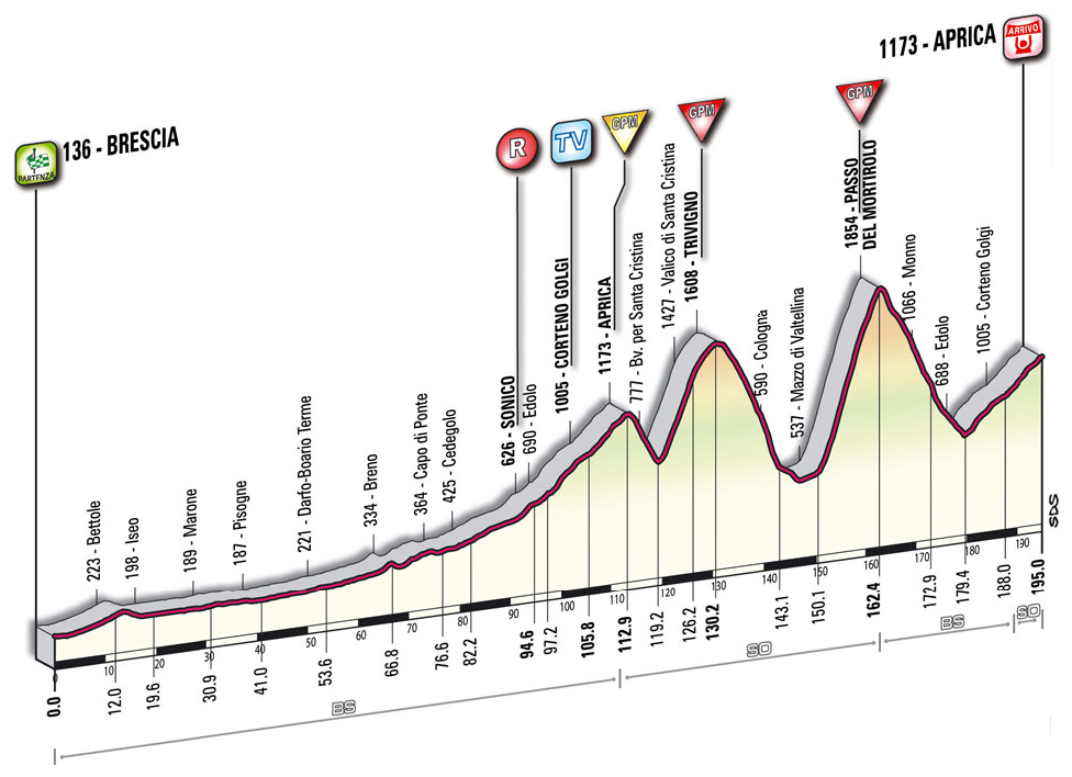 Después de la jornada descanso, la carrera continúa con la etapa reina. Y precisamente con llegada en Aprica, teniendo que superar de inicio Campo Carlo Magno, 13 km al 6,5% y que salvo el tramo final coincide con Madonna di Campiglio, y el Passo del Tonale, con 12,5 km al 6,6% (sin contar el falso llano de la cima) antes de una larga bajada hacia Edolo, afrontando a partir de ahí un circuito que incluye Aprica por Santicolo, vertiente estrenada en 2010 y que cuenta con un km inicial al 12%, y tras su descenso, muy técnico en su 2ª mitad, y el paso por Tirano el mítico Mortirolo por Mazzo, el puerto más decisivo del Giro en las últimas décadas y que con 12 km al 10,8% de media y un coef. APM de 480 está en el top-10 de los puertos más duros en carrera. Terminado el descenso, que como como ya se vió en 2010 también puede resultar clave, aún faltará un último paso por Aprica, una subida que colocada tras el Mortirolo hace mucho daño debido al desgaste previo, provocando que las diferencias se disparen.