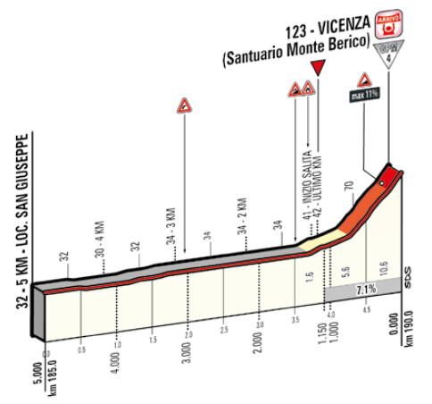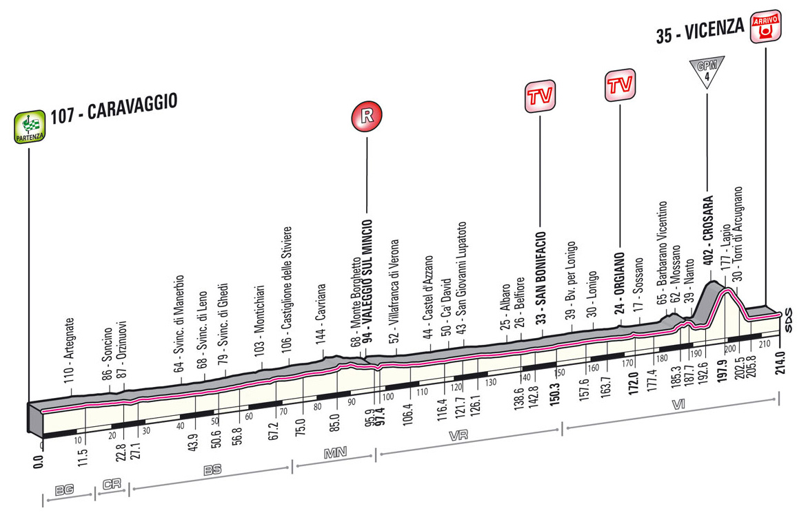 La 12ª etapa, entre Ímola y Vincenza, también es de media montaña pero con una estructura distinta, con 130 km iniciales muy llanos y la dureza concentrada en el tercio final, con las cotas de Castelnuevo, Crosara, que con 1,8 km centrales al 13,5% entra en la lista de km más duros en competición, y Perarolo (2 km al 8,1%), antes del repecho de Monte Berico, con 750 m al 10% y donde estará situada la meta, siendo una jornada favorable para los “up-hill finishers”. Señalar que Vincenza ya acogió una etapa hace apenas 2 ediciones, también con paso previo por Crosara aunque subido por otra vertiente y como único puerto -> perfil / clasificación, llevándose el triunfo Giovanni Visconti. La jornada siguiente, con final en Jesolo, es totalmente llana, con el paso junto a la Laguna de Venecia como único aspecto destacable, por lo que salvo abanicos el sprint masivo parece cantado.