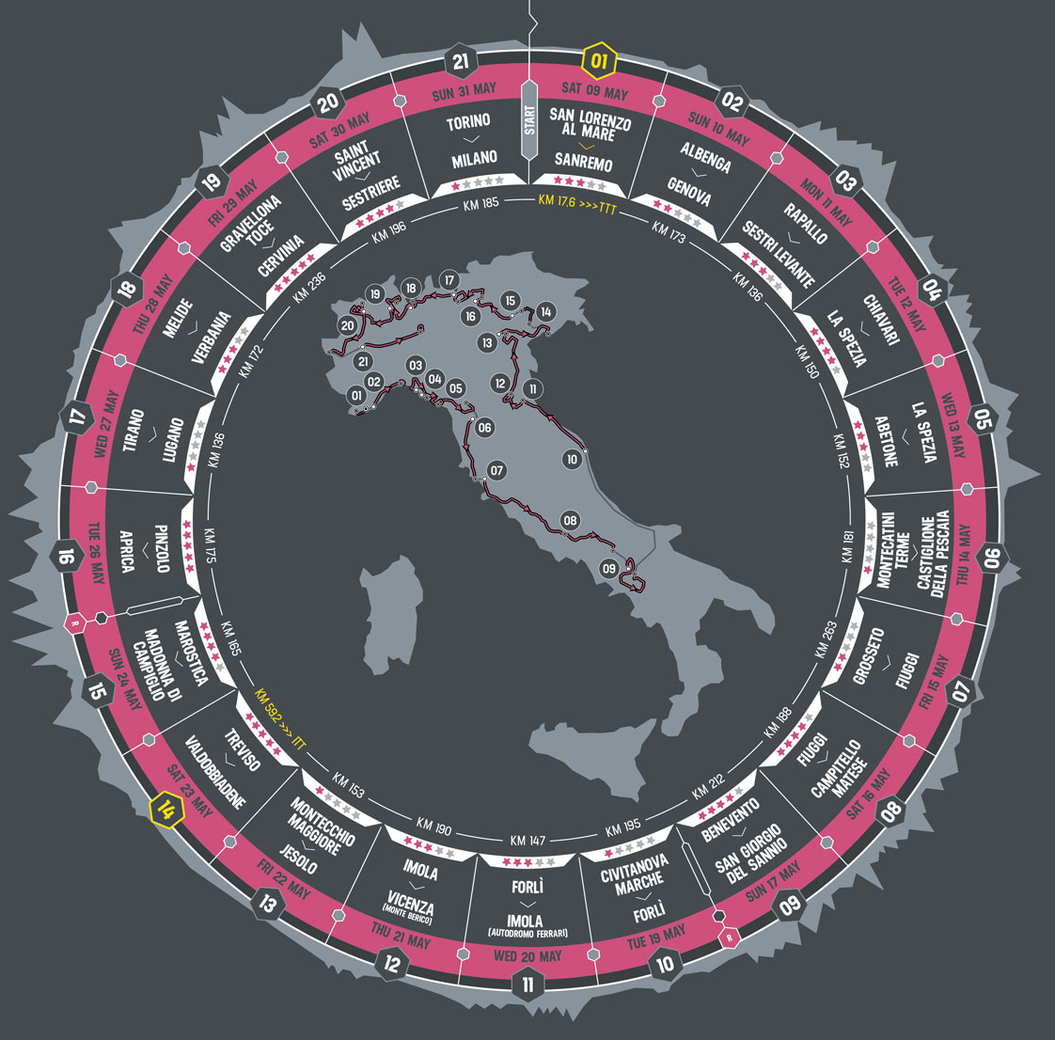 Con salida desde San Lorenzo al Mare, en la región de Liguria, y llegada en Milán, la capital de Lombardía, los ciclistas recorrerán el país transalpino en sentido contrario a las agujas del reloj, teniendo que afrontar 21 etapas para un total de casi 3500 km, incluyendo 2 contrarrelojes, una por equipos y otra individual, esta última de casi 60 km; y 19 etapas en línea, destacando las jornadas de Aprica, con paso por el mítico Mortirolo; Cervinia, un maratón de casi 240 km con los 3 últimos puertos encadenados; y Sestriere, incluyendo el impresionente Colle Finestre, con los últimos 8 km sin asfaltar.
