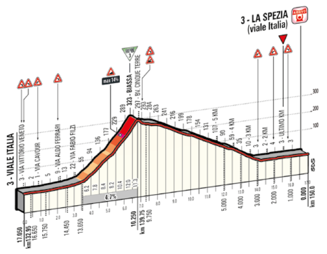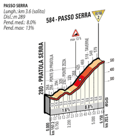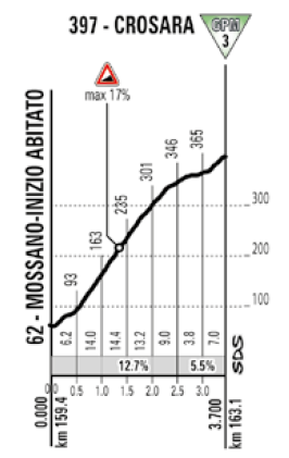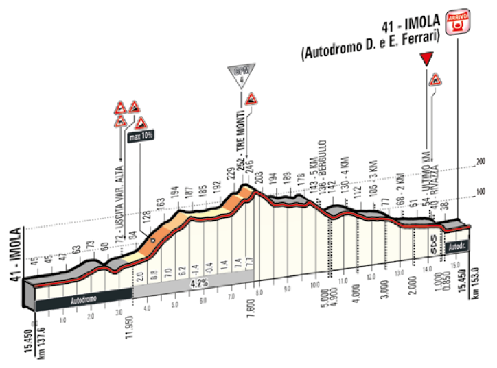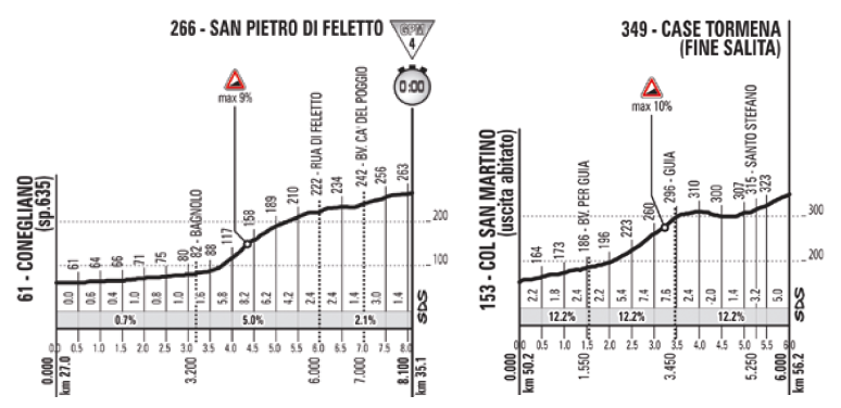 El fin de semana llega una etapa clave y que puede marcar el desarrollo de la prueba: una crono individual de 59 km entre las localidades de Treviso y Valdobbiadene, con una 1ª mitad llana y de trazado rectilíneo, perfecta para los rodadores, y una 2ª parte más revirada y con las cotas de S. Pietro Feletto y Sto. Stefano, sin grandes rampas pero que en el caso de Santo Stefano, ya en los km finales, hará daño a los corredores que no hayan sabido regular. En definitiva, una crono muy exigente, de como mínimo 1h 15′ de duración (los mejores y siempre que no haya viento en contra), y que puede provocar grandes diferencias. Para encontrar una CRI así habría que remontarse a 2009, si bien la de Saltara 2013, con 55 km y triunfo para Dowsett, se acercaba bastante, aunque siendo más quebrada (debido a la escala el perfil de 2013 resulta engañosamente blando).