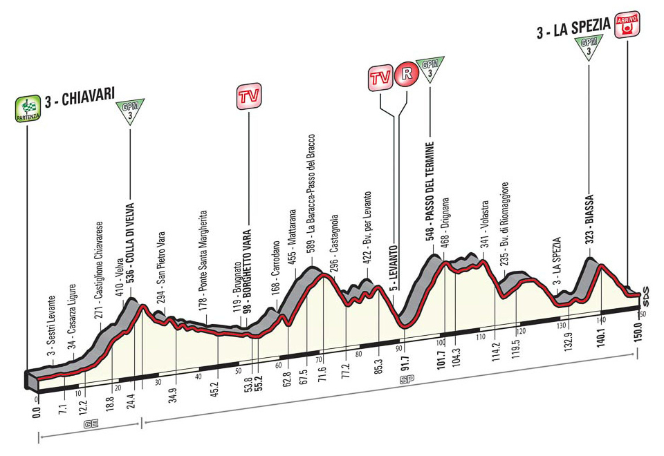 En la 3ª jornada llega la media montaña, con una etapa muy corta entre Rapallo y Sestri Levante pero que durante sus primeros 100 km no ofrece apenas respiro, destacando el Colle Caprile y sobre todo Barbagelata, con 5,5 km al 8%. Sin embargo, después de su largo descenso, que cuenta con tramos muy revirados, hay casi 25 km llanos hasta alcanzar la meta, pudiendo decidirse mediante una escapada o con un sprint reducido en el pelotón. Al día siguiente continúa la media montaña pero ya con un recorrido más selectivo, incluyendo el Colle di Velva y el Passo del Bracco antes del exigente Passo del Termine, con 6 km centrales al 7,3%, para tras un primer paso por línea de meta afrontar un circuito final que incluye la dura cota de Biassa, con 3,3 km al 9% (1,5 km finales al 11%) y coronándose a sólo 10 km de meta, la mayoría de descenso. Una jornada interesante y que puede dar mucho juego, incluso con cortes de tiempo entre los favoritos.