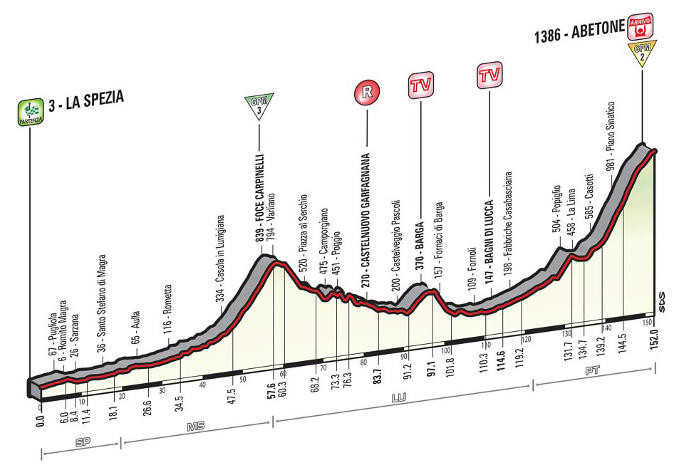 En la 5ª jornada, que de nuevo rondará la 150 km, será el turno para la primera llegada en alto de esta edición, con los ciclistas teniendo que superar el tendido Passo Carpinelli, con 12 km al 4,9%, y las cotas de Barga y Poligno antes de la subida final a la estación de Abetone, con 8,5 km centrales a más del 7%, para unas cifras totales de 17,3 km al 5,4% de media, aunque si los favoritos dejan la batalla para los km finales, en general muy suaves, será difícil que haya diferencias. La última llegada en Abetone, subiendo por la vertiente contraria, se produjo hace 15 años, en una de las mejores etapas del año 2000 gracias al ataque de Casagrande en San Pellegrino in Alpe (Passo Pradaccio), un espectacular puerto que se podría haber incluído en esta jornada, aunque quizás los organizadores han pensado que era demasiado pronto para afrontar una subida tan dura.