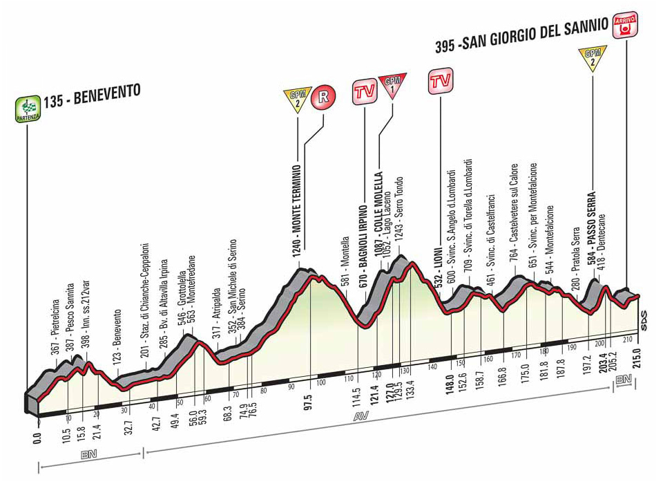 Al día siguiente, en vísperas de la jornada de descanso, larga etapa de media montaña entre Benevento y San Giorgio del Sannio, con un sube y baja durante casi toda la ruta y destacando por su dureza la parte central, con el encadenado de Monte Terminio, sin grandes rampas pero muy largo, y el Colle Molella, con 3 km centrales al 10% y más conocido como Lago Laceno debido a los finales de etapa, con triunfos para De Vlaeminck (1976), Zulle (1998) y Pozzovivo (2012) respectivamente. Ya en la parte final los corredores tendrán que superar el Passo Serra, con 2 km centrales a más del 9% y la cima a sólo 12 km de meta, que también pica hacia arriba, siendo una llegada similar a la de Fiuggi. Una etapa exigente y muy favorable para las escapadas, incluso con posibilidades de fuga-bidón si ningún equipo puede o quiere controlar, teniendo además una última cota donde podría haber ataques de los favoritos.