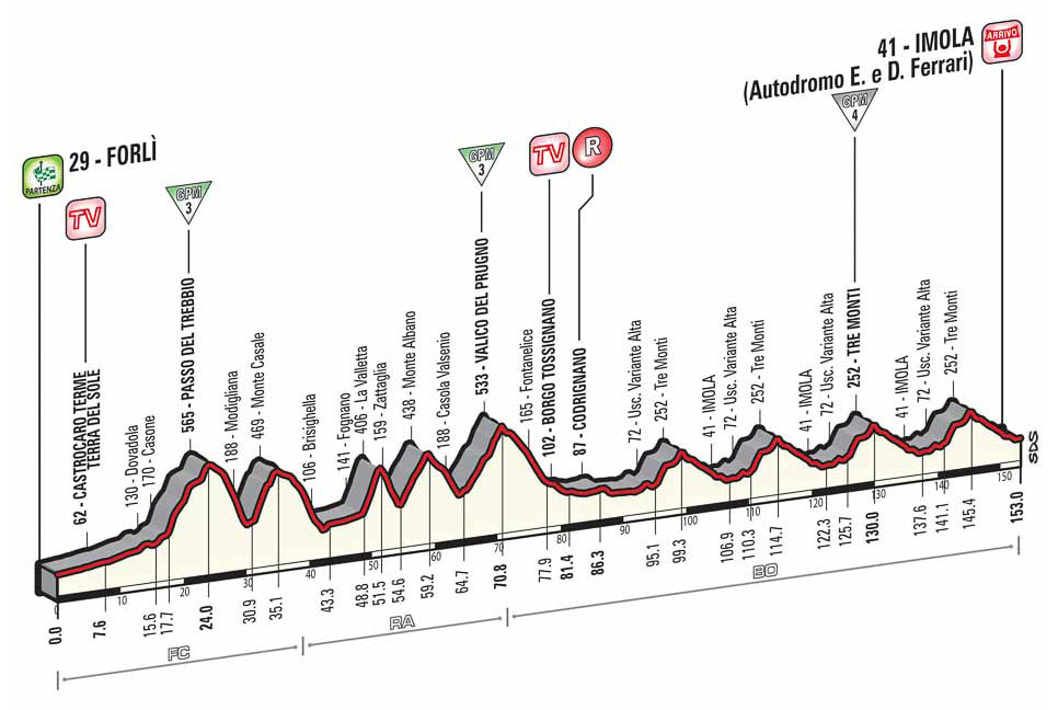 Después del traslado a Civitanova Marche, la prueba se reanuda con una etapa llana de 200 km y meta en Forli, en la región de Emilia-Romagna, circulando la mayor parte de la ruta en paralelo al Adriático y con riesgo de abanicos, aunque de todos modos es muy favorable para los sprinters. En cambio la jornada siguiente es un auténtico “serrucho”, con los puertos de Passo Trebbio, Monte Casale, La Valletta, Monte Albano y Valico del Prugno, los 4 primeros conocidos por las etapas de Faenza 2003 y 2009 (aunque subidos en sentido contrario), para tras el descenso de Prugno y 15 km llanos llegar a los alrededores de Imola, donde se darán 4 vueltas (una más que las anunciadas en octubre) a un circuito de 15 km que incluye la cota de Tre Monti, la subida estrella del Mundial de 1968 (con triunfo para Adorni), y con la meta en el Autódromo E. y D. Ferrari. Una etapa imprevisible, con terreno inicial para fugas y una parte final favorable para clasicómanos. En la anterior llegada, en 1992, se impuso Paganin, con exhibición de Chioccioli que puso en jaque a Banesto.