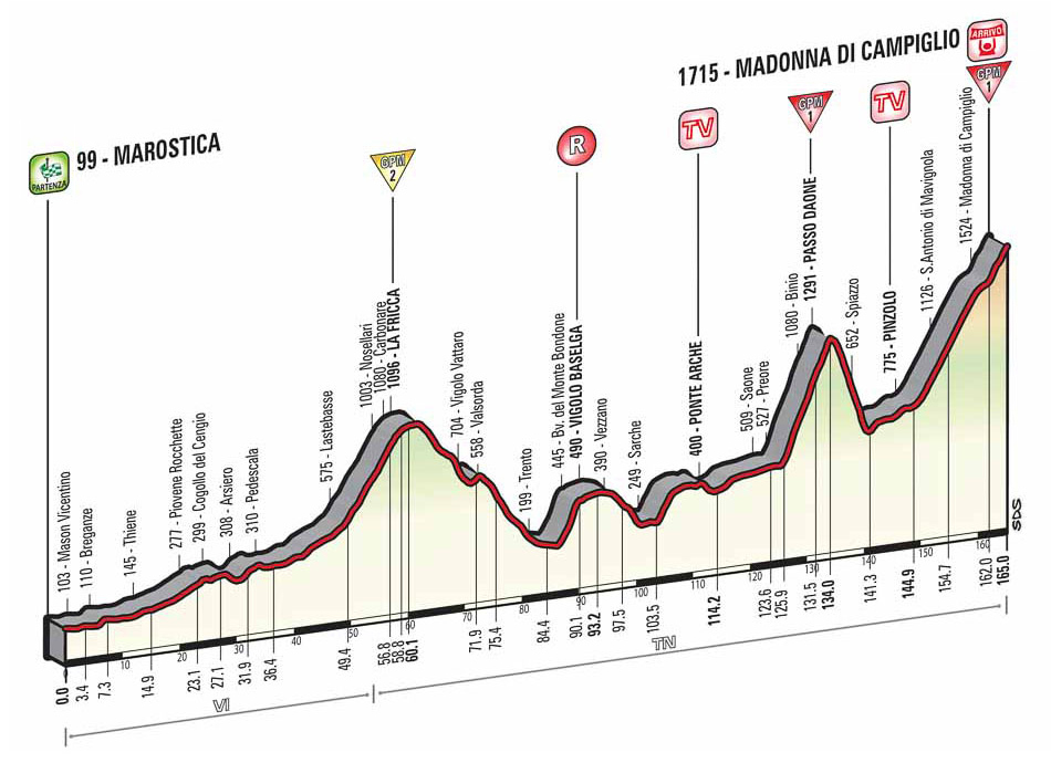 En vísperas del día de descanso, le toca el turno a la jornada de Madonna di Campiglio, la etapa que los organizadores dieron a conocer antes de la presentación para hacer de gancho. Y aunque no es la más dura, sí tiene un recorrido exigente y que puede dar mucho juego a poco que los corredores sean ofensivos, con los puertos de La Fricca (hasta el cruce del km 3,5), con 10 km al 5,5%; Cadine-Vigolo Baselga, con 4 km al 7%; y Passo Daone, con 8 km al 9,5%, antes de la subida final, con casi 10 km constantes al 6-7% y tras un descansillo un añadido final de 3 km hasta alcanzar el refugio Patascoss, con rampas de hasta el 12%, para unas cifras oficiales de 15,5 km al 5,9%. El único final de Campiglio en el Giro data de 1999 -> perfil / vídeo, con victoria para Marco Pantani … hasta que a la mañana siguiente saltó la noticia de que había superado el máximo de hematocrito permitido, siendo expulsado de la carrera. Más recientemente ha habido llegadas del Giro del Trentino, con triunfo de Kreuziguer -> vídeo; y del Tour de Polonia, con victoria para Ulissi.