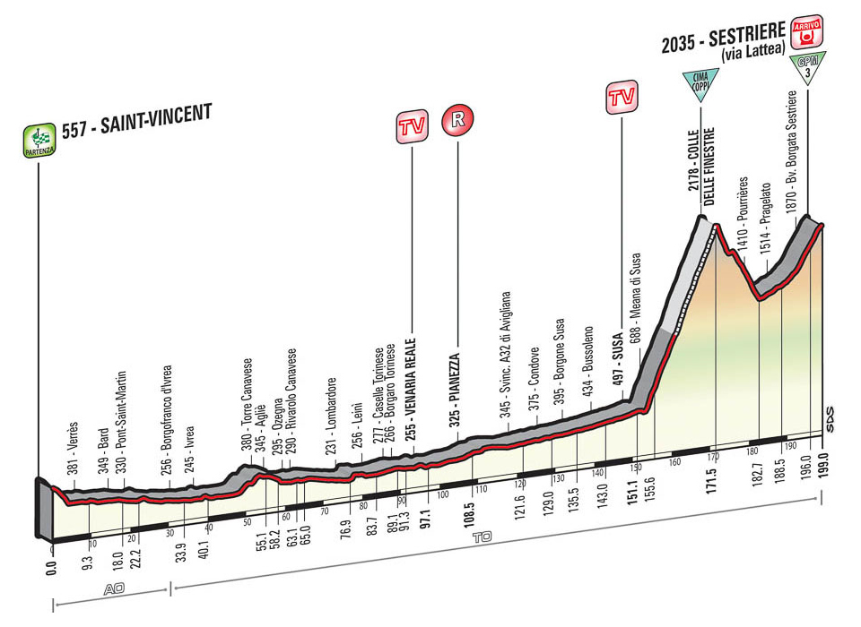 Y como última etapa de montaña, un encadenado ya clásico en los últimos años: el impresionante Colle delle Finestre -> galería de fotos, destacando por su regularidad, con 18,5 km al 9,2% de media, y los últimos 8 km de «sterrato» (en buen estado), siendo además la Cima Coppi de esta edición; y tras su rápido descenso el Colle Sestriere, en general tendido y por una carretera ancha pero con un tramo de 5,5 km al 6,3% cerca de la cima. Una parte final de etapa fantástica, con Finestre para romper y Sestriere para terminar de decidir, si bien se echa en falta más desgaste previo, como si tenía la etapa de 2005, cuando se estrenó este coloso con gran éxito deportivo y de público. Más similar a la ruta de 2015, al no incluir otros puertos antes del dúo final, aunque con mayor kilometraje, fue la etapa de 2011, con victoria para Vasil Kiryienka tras una cabalgada espectacular -> clasificación / vídeo.