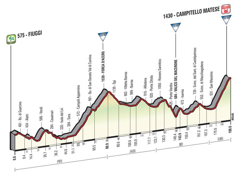 8ª ETAPA (Sábado 16 Mayo):  FIUGGI – CAMPITELLO MATESE  (186 km).  Info oficial