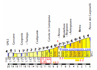 • Biassa, 3ª (km 140,1):  323 m – 3,4 km – 8,9 %