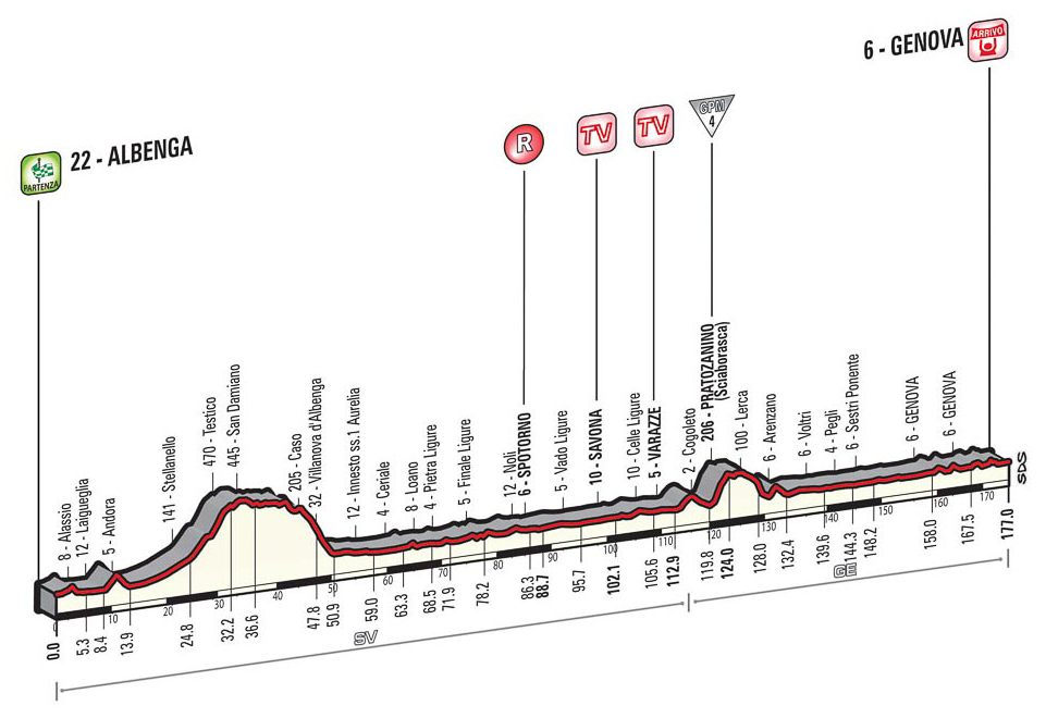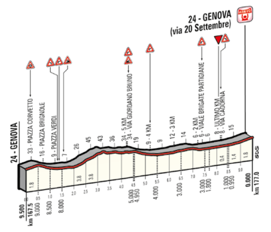 2ª ETAPA (Domingo 10 Mayo):  ALBENGA – GENOVA  (177 km).  Info oficial