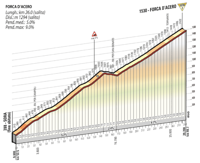 • Forca d´Acero, 2ª (km 80,7):  1.530 m – 28,2 km – 4,4 %