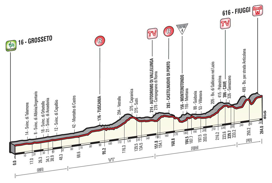 En vísperas de un nuevo bloque de montaña, la etapa más larga de esta edición, con 264 km entre Grosseto, capital de la provincia homónima, y Fiuggi, perteneciente a Frosinone, en la región de Lazio, sin grandes ascensiones aunque si con un perfil ondulado durante gran parte del trayecto, incluyendo dos cotas en la parte final, ambas tendidas pero que con el desgaste previo pueden seleccionar el pelotón, sobre todo si el ritmo es elevado, finalizando además con un último km en ligera subida. En definitiva, una jornada propicia para los clasicómanos y velocistas más completos, sin que tampoco se pueda descartar una escapada.
