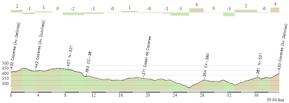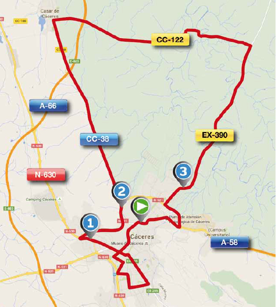 Domingo 28 junio:  CACERES – CACERES  (189,4 km: 39,2 km x 5 vueltas).  Rutómetro