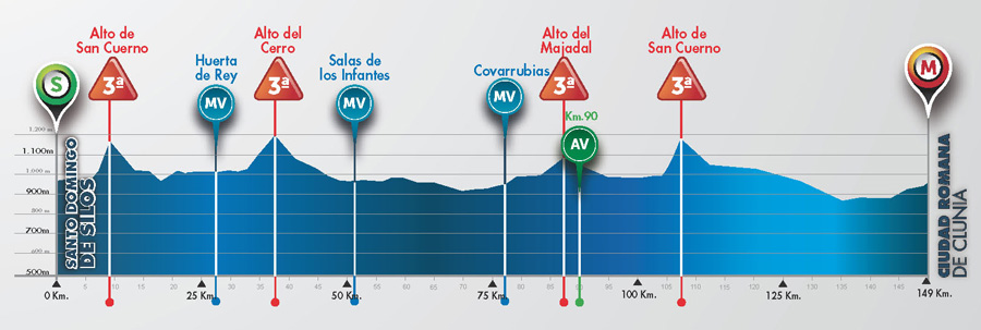 La prueba comienza con una etapa de 150 km entre Santo Domingo de Silos, localidad famosa por su monasterio, y los restos arqueológicos de la ciudad romana de Clunia, junto al pueblo de Peñalba de Castro, con un bucle en la parte inicial de la etapa que incluye el Alto de la Yecla (llamado erróneamente San Cuerno por la organización), El Cerro y el encadenado Retuerta + Majadal, para tras un 2º paso por la Yecla dirigirse hacia el sur, atravesando una zona propicia para los abanicos, hasta llegar a Peñaranda de Duero, donde se virará hacia el noreste en busca de la subida final a Clunia.