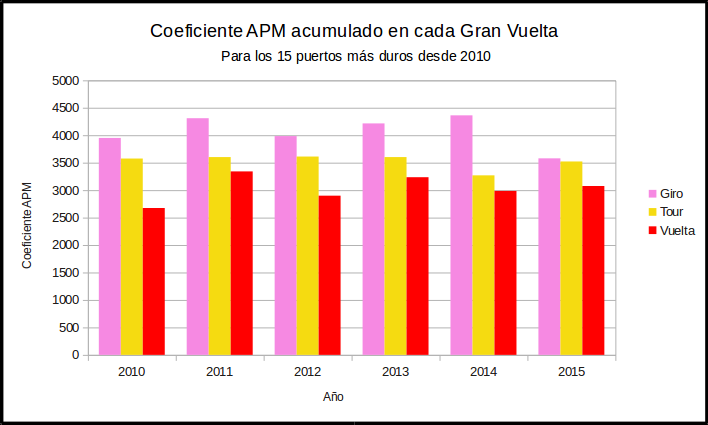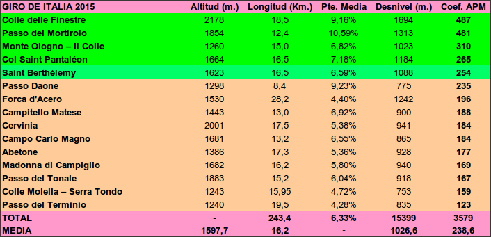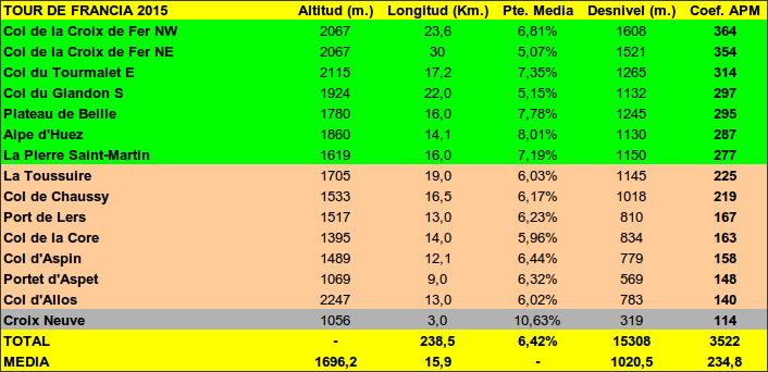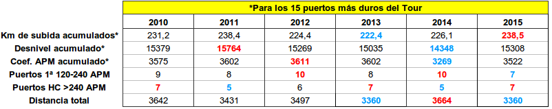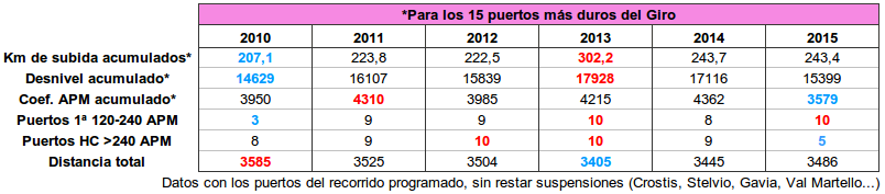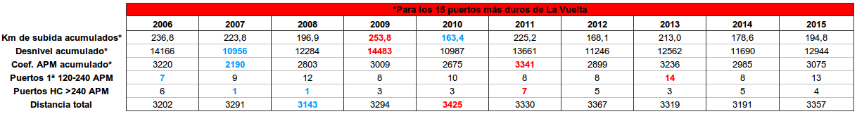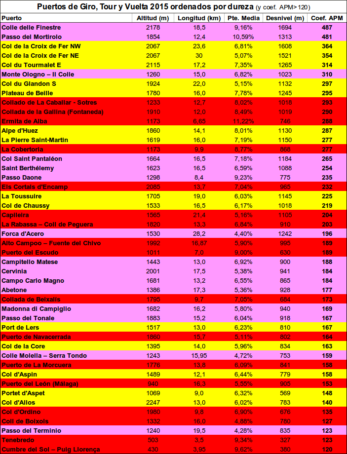 Todos los años, después de conocerse el recorrido de las 3 Grandes Vueltas, realizamos una comparación de la montaña de las mismas, y 2015 no fue menos. Sin embargo, con los cambios posteriores que hay en los recorridos, y en algunas ocasiones con la actualización de los datos de los puertos cuando se publican perfiles más detallados, los números finales varían. Eso ha ocurrido este año, al desaparecer el Galibier del Tour, siendo sustituído por Croix de Fer, incluir el Puerto del León en La Vuelta, llegarse más arriba en Capileira, conocerse un perfil más detallado de Beixalís o dar sendos rodeos en Els Cortals y Cumbre del Sol. Para mostrar como quedaría la comparativa actualizada, hemos realizado esta entrada con todas las tablas de datos, aunque menos texto del habitual.