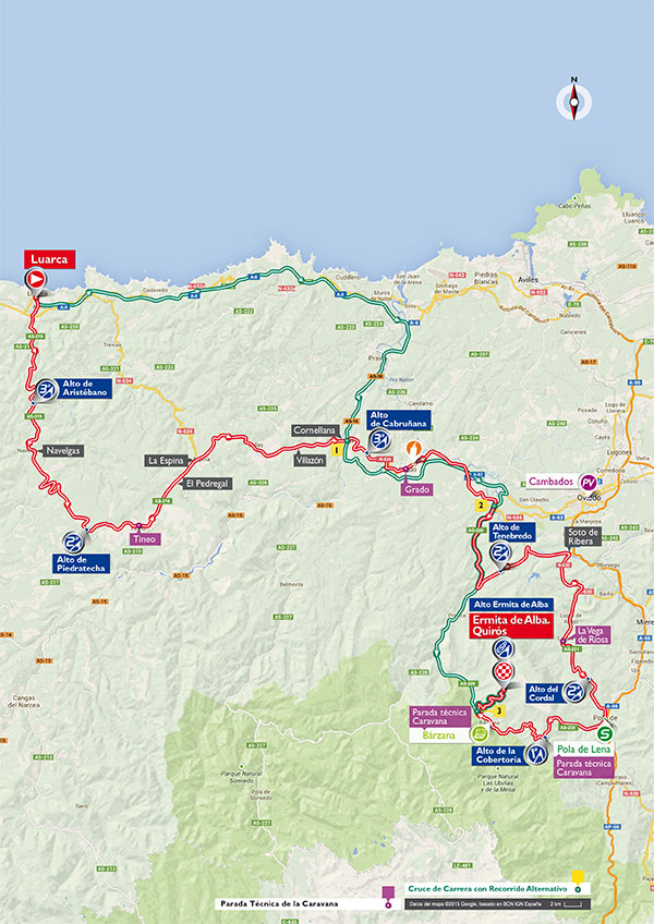 Superada la jornada de Alto Campoo y en vísperas de la dura etapa de Ermita del Alba, jornada de 176 km entre Comillas y la Collada Caballar, junto a la localidad asturiana de Sotres, con una primera mitad de la ruta en general llana, circulando en paralelo a la costa, para a partir del km 70 girar hacia el interior y afrontar los puertos de La Cruz / Las Coronas (no puntuado); el Collado del Torno, muy irregular pero con tramos duros, subiendo por la vertiente utilizada como descenso en 2014; y el Alto de Ortiguero, con 6 km al 5%, antes del paso por Arenas de Cabrales y la bonita subida final a la Caballar, en plenos Picos de Europa, contando, además de la belleza de sus paisajes, con una gran dureza, para unas cifras totales de 12,7 km al 8% de media.