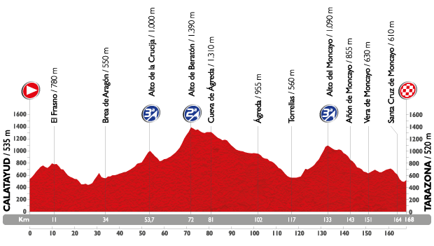 En vísperas del duro tríptico de la Cordillera Cantábrica, etapa de media montaña entre Calatayud y Tarazona, en la provincia de Zaragoza, con los pequeños puertos de Cavero, la Campeja y la Crucija antes de la subida a Beratón, con 6 km finales al 6,2%, para tras un largo falso llano descendente y el paso por Torrellas y Vera del Moncayo, con un buen repecho entre ambas localidades, afrontar el Alto del Moncayo, ya incluído en la crono de 2013 (aunque por otra vertiente) y desde cuya cima restarán 34 km hasta meta, con varios km de cresteo antes del descenso hacia Santa Cruz del Moncayo y Tarazona, aunque en lugar de acabar directamente se hará un bucle llano de casi 15 km, lo que puede provocar reagrupamientos.