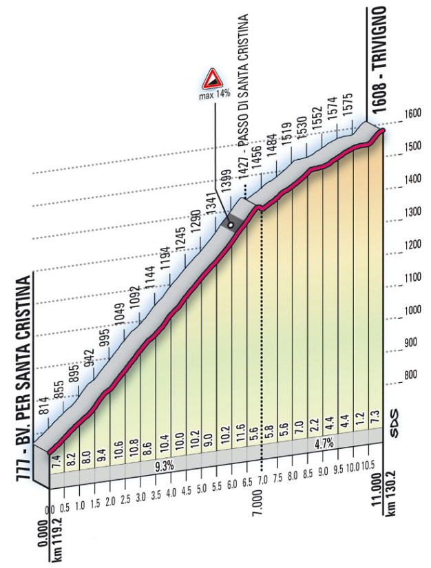 Y es que aún restaba la jornada reina, con final en Aprica tras un durísimo recorrido que incluía el Passo del Tonale y la «Cima Coppi», el Passo di Gavia, con 16,5 km al 8%, en la primera mitad de la ruta, y ya en la parte final el terrorífico Mortirolo, con 12 km al 10,8%, seguido por el suave ascenso a Aprica y el muro de Santa Cristina (hasta el km 7), antes del rápido descenso hacia meta, en una etapa con los últimos 90 km, a partir de Bormio, idénticos a los de la mítica jornada de 1994.