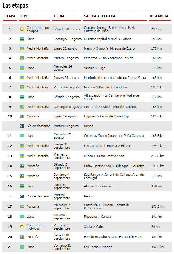 Desde hace unos días ya están publicados en la web oficial los perfiles definitivos de las etapas (aunque no los rutómetros y mapas), confirmándose los cambios que mencionábamos en el anterior mensaje: supresión de O Picato en la etapa de Lugo (5ª); sustitución de Tarna en la del Naranco (9ª), subiendo San Isidro para después afrontar San Emiliano + Tirso antes del Padrún; y los últimos 40 km en la etapa de Urdax (13ª), sustituyendo el encadenado de 3 puertos anunciado en enero por un circuito con las suaves cotas de Zugarramurdi y Saint Ignace, repitiendo el tercio final que se hizo en la Itzulia 2014.