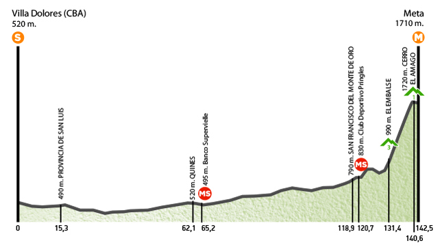 Por otro lado, teniendo en cuenta que se repite el duro final en Sierras Comechingones, no hubiera estado mal que la etapa del Cerro del Amago, en lugar de terminar en la cima, acabara en La Carolina tras un terreno de repechos -> perfil etapa 2011, el final clásico y que daba lugar a bonitas persecuciones, favoreciendo que hubiera ataques lejanos y mas tiempo de lucha entre los favoritos. Otra opción sería haber endurecido la etapa de La Punta, realizando un doble paso por el Mirador del Potrero.
