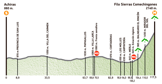 - Filo Sierra Comechingones, 1ª (Meta): 2.140 m – 7 km – 9,9 %