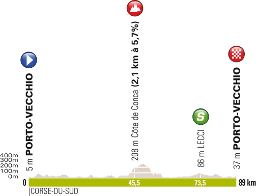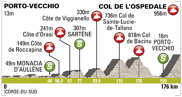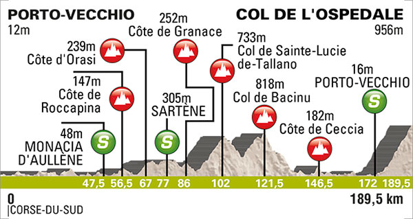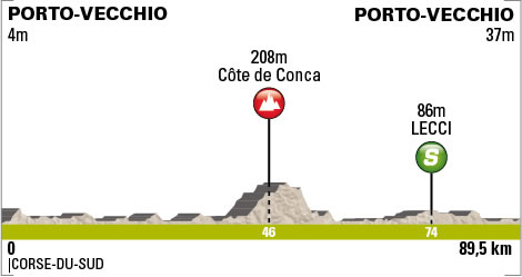 Etapa alternativa con salida y llegada en Porto Vecchio, pasando por Conca (3), Larone-Bavella (HC), Quenza (np), Mela (2) y Bacinu (2)