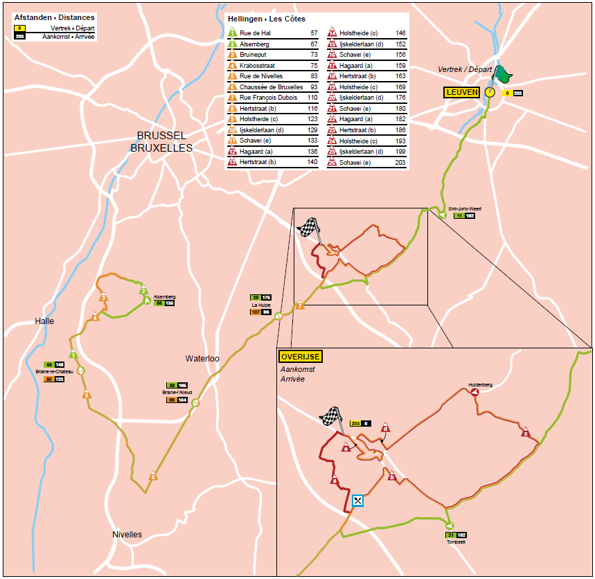 Los primeros 50 km de la prueba, casi siempre en dirección suroeste, son básicamente llanos, pero tras el paso por el municipio de Nivelles la ruta se complica, teniendo que superar nada menos 26 cotas durante los últimos 150 km de la prueba, aunque varias de ellas repetidas en múltiples pasos, habiendo en realidad “sólo” 12 cotas distintas. En general no tienen mucha pendiente, si bien alguna cuenta con la superficie adoquinada, pero su acumulación provoca que sea una prueba exigente y de mucho desgaste.