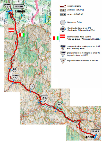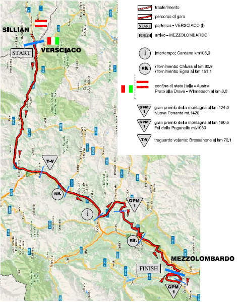 Así pues, la prueba comienza con una crono por equipos de 12 km, con salida en Riva del Garda y meta en la cercana localidad de Arco, junto al Lago di Garda, teniendo un perfil bastante llano y donde la mayor complicación puede venir por la presencia de algunas curvas cerradas, sobre todo en los primeros km, siendo en cualquier caso favorable para las escuadras con buenos rodadores. La etapa siguiente, con final en la población austríaca de Anras, es la más larga de esta edición, con 220 km y un recorrido con tendencia ascendente que incluye 3 puertos: Vigolo Baselga, Naz-Sciaves y la irregular subida final, con un principio muy duro, con 1,8 km iniciales al 10%, y que tras el descansillo intermedio, con un pequeño descenso incluído, culmina con otros 500 m al 10%, para unas cifras totales de 3,7 km al 6,9% de media, pudiendo hacer bastante daño si se sube a tope desde el inicio, aunque si los favoritos esperan al muro final las diferencias serán pequeñas.