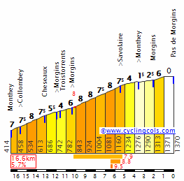 - Pas de Morgins, 1ª (km 171,8): 1.278 m – 8,9 km – 6,3 % *sigue subiendo hasta meta