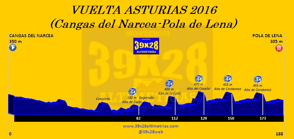 2ª ETAPA (Domingo 1 Mayo): CANGAS DEL NARCEA – POLA DE LENA (188,2 km). Info en la web / Rutómetro / Mapa salida – llegada
