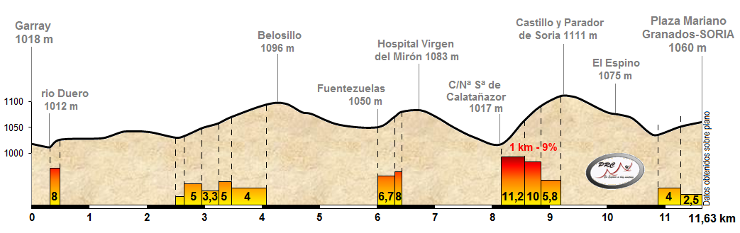 Tras coronar Piqueras y entrar definitivamente en la provincia de Soria, aparecen 10 km de bajada y unos 20 km de terreno favorable, por amplia carretera y grandes rectas hasta llegar a Garray, que son sin duda la mayor pega de esta etapa. En Garray, bajo el cerro de Numancia, la etapa retoma interés con la aparición de algún repecho de «calentamiento» antes de, ya en las calles de Soria, afrontar la decisiva subida al Parque del Castillo, donde se encuentra el Parador. Aproximadamente 1 km al 9% que terminan a 2,5 km de la llegada, a la que se accede tras una vertiginosa y técnica bajada y un repecho de 600 m al 3-4%.